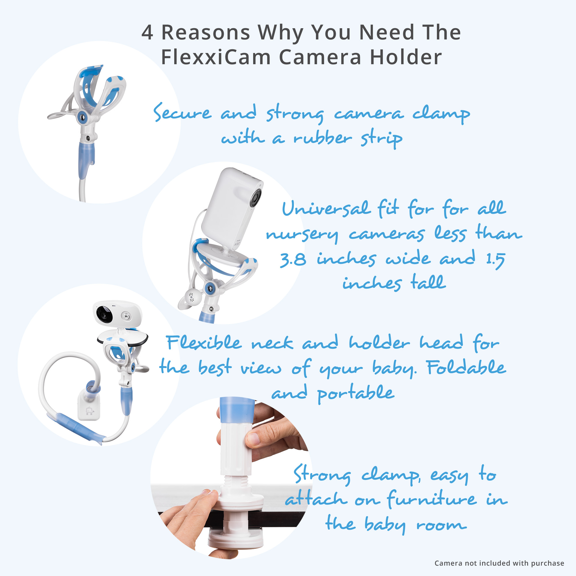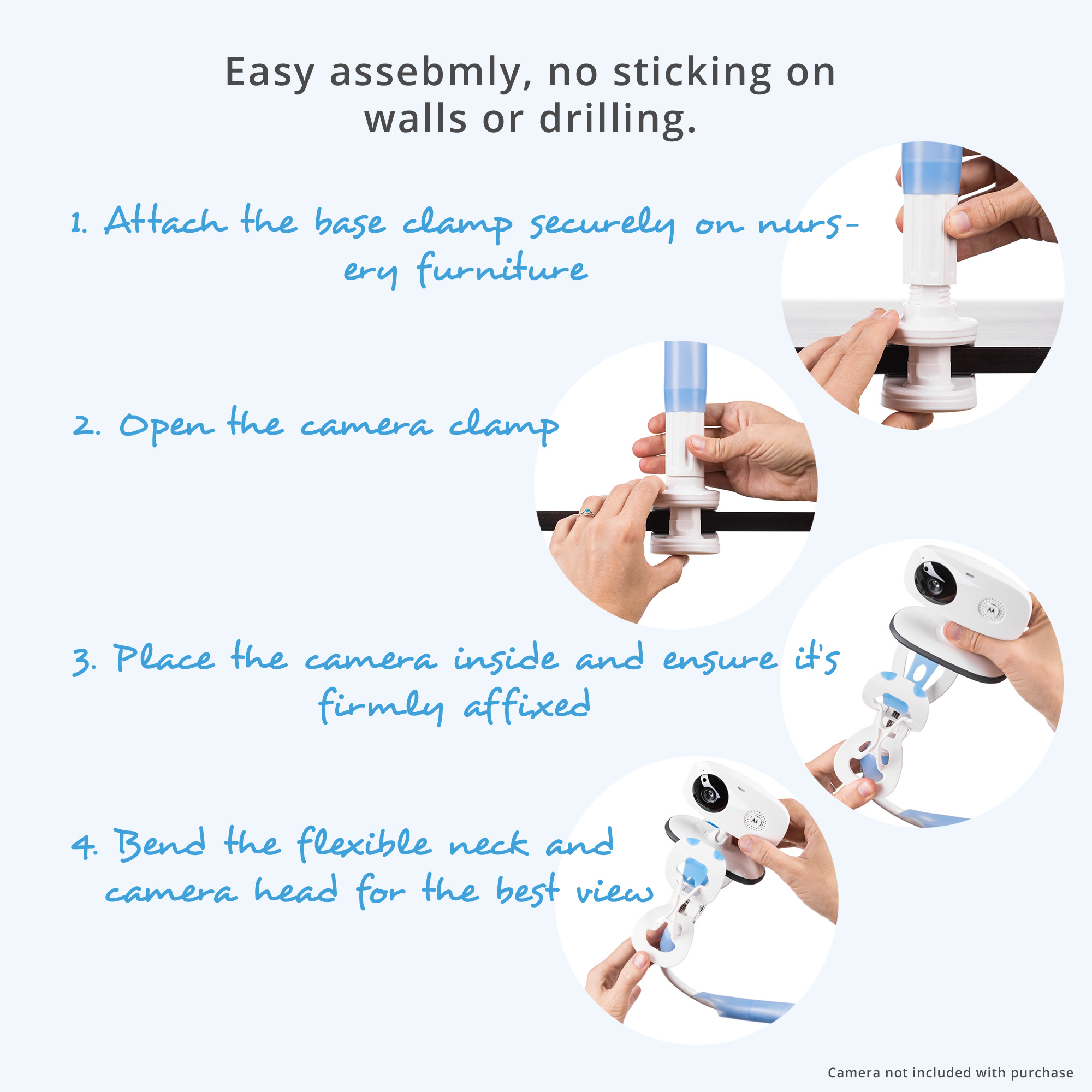Its installation is super easy. You can attach it by a clamp to any furniture in the nursery. Unlike other products, FlexxiCam does not require any drilling or sticking to walls.
